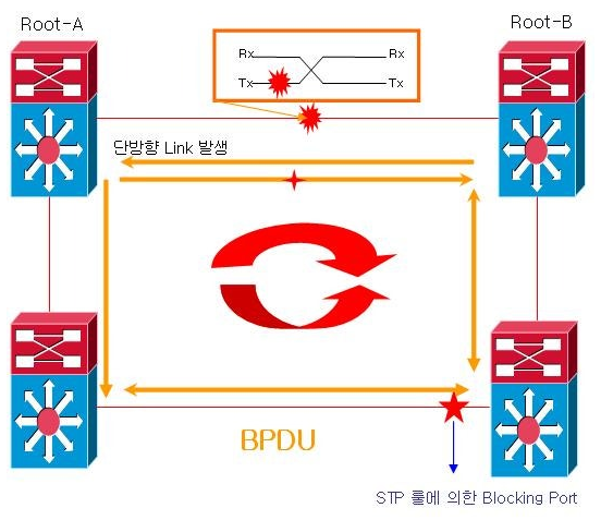 즉, Root-A는 지속적으로 Root-B와 하단 Switch 로 FWD 상태로 BPDU를 보내게 되고 Root-B는 자신의 Link가 문제가 있다는 BPDU를 보내어 하단측 Blocking Port를 FWD 상태로 유지하도록 요청하여 STP Loop이 발생