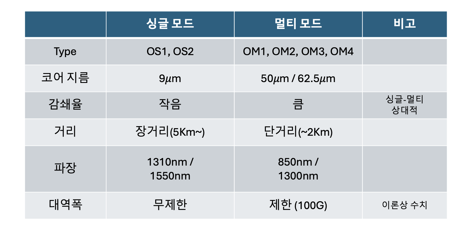 싱글모드 케이블은 지름이 좁기 때문에 높은 대역의 파장을 사용합니다. 1310 또는 1550nm 파장을 사용하고, 멀티모드의 경우 850 또는 1300nm 파장을 사용합니다. 파장과 거리를 비례한다고 생각하시면 좀더 이해가 편할 것 같습니다.