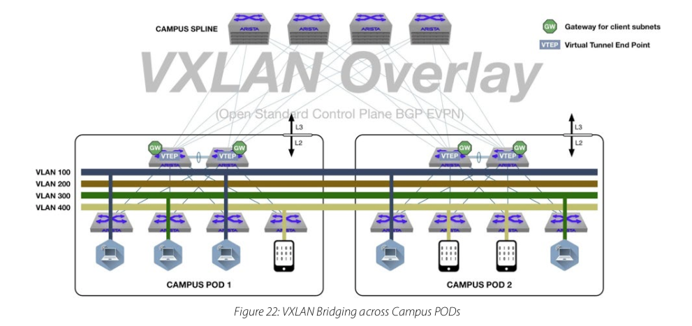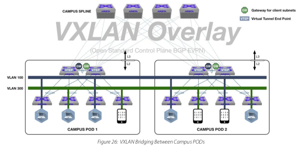 이전 Campus POD 설계 섹션에서 설명한 것처럼 VLAN은 클라이언트 서브넷 기본 게이트웨이가 종료되는 Campus POD MLAG 쌍 계층까지 확장됩니다. 일부 시나리오에서는 L2 VLAN을 다른 Campus POD로 확장해야 합니다.
