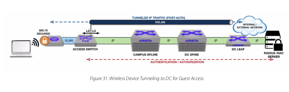 아래에는 유선 게스트 액세스에 대한 엔드 투 엔드 트래픽 경로의 특정 예가 나와 있습니다. 로컬 인터넷 액세스가 있는 경우 캠퍼스 내에서 터널이 종료되거나 DC로 터널링되어 DMZ 서브넷에 착륙할 수 있습니다.